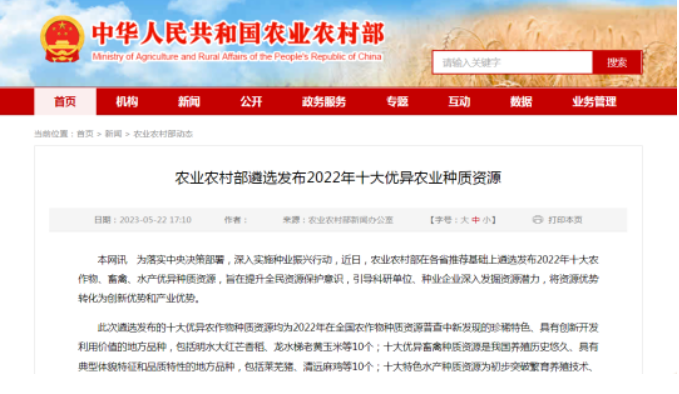 為落實(shí)中央決策部署,深入實(shí)施種業(yè)振興行動,近日,農(nóng)業(yè)農(nóng)村部在各省推薦基礎(chǔ)上遴選發(fā)布2022年十大農(nóng)作物、畜禽、水產(chǎn)優(yōu)異種質(zhì)資源,旨在提升全民資源保護(hù)意識,引導(dǎo)科研單位、種業(yè)企業(yè)深入發(fā)掘資源潛力,將資源優(yōu)勢轉(zhuǎn)化為創(chuàng)新優(yōu)勢和產(chǎn)業(yè)優(yōu)勢。